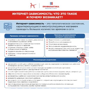 Интернет-зависимость называют аддикцией, т.е. отклонением в поведении, при котором у человека нарушается чувство реальности, теряется ощущение времени, утрачивается критическое мышление, ограничивается руководство своими поступками. Ребёнок становится менее активным, нарушается цикл сна и бодрствования. Наступает психическая и физическая зависимость.